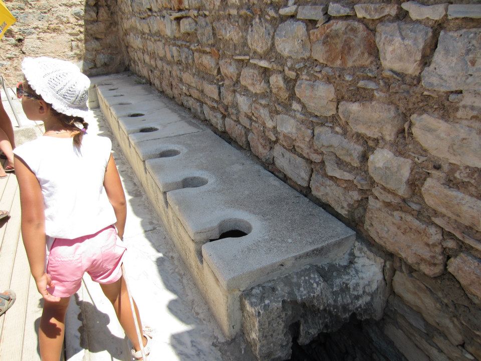 At Ephesus, the classic guide stories involve the public latrines. Guides will tell you all kinds of stories about the toilets – the more scatological the better. Slaves kept the seats warm for their masters! Romans cleaned themselves with sponges on sticks! Etc, etc. Very few, if any, of the stories told by the guides at the latrines are substantiated by scholarship, but that doesn’t meant make them any less entertaining or popular with the tourist who flock to the site by the busload to have their picture taken sitting on an ancient crapper.