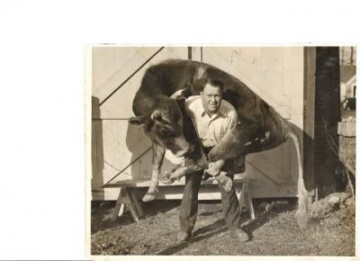 This is Robert Edward “H.E.” Mann, a strong man who lived in Tennessee. According to relatives, he trained for this feat just like Milo, picking up this bull every day since it was a calf. There are those out there who do not buy this – they think the photo is doctored. I don’t know, looks real enough to me. Besides, like the image of Bill Rodgers running in circles around the same pond in a Boston suburb day after day, year after year, the idea of a guy somewhere in Tennessee in the 1950’s picking up a cow everyday just warms my heart.